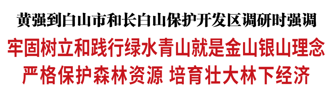 11月13日,省委书记黄强到白山市和长白山保护开发区调研。他强调,要深入学习贯彻习近平生态文明思想,牢固树立和践行绿水青山就是金山银山理念,认真落实森林法和古树名木保护条例,严格保护森林资源,培育壮大林下经济,更好促进人与自然和谐共生。