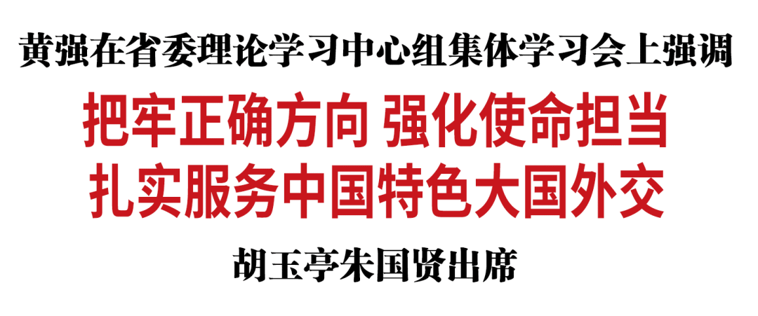 2月9日,省委书记黄强主持召开省委理论学习中心组集体学习会。他强调,要深入学习贯彻习近平外交思想,深化对做好地方外事工作的规律性认识,把牢正确方向,强化使命担当,扎实服务中国特色大国外交。省委副书记、省长胡玉亭,省政协主席朱国贤出席会议。