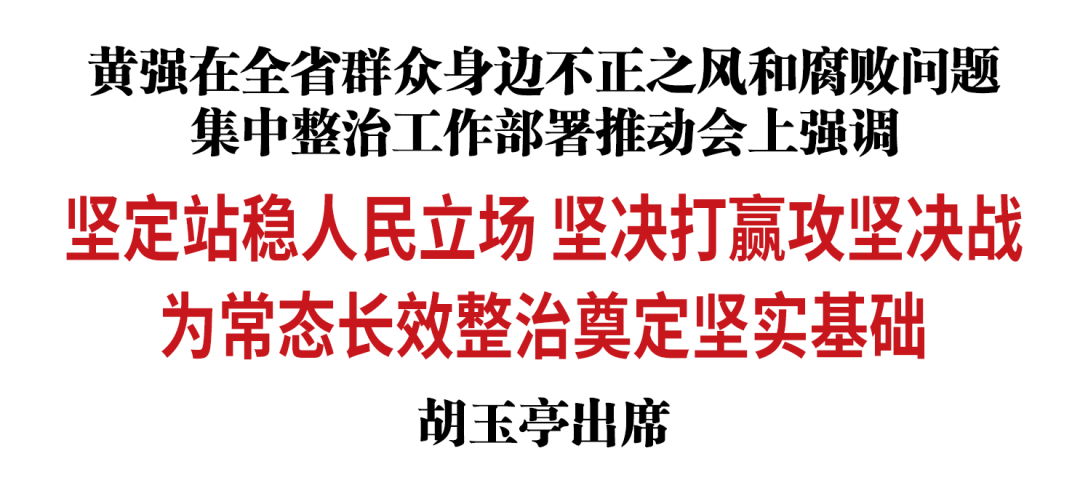 2月9日,全省群众身边不正之风和腐败问题集中整治工作部署推动会以视频形式召开。省委书记黄强主持会议并讲话。他强调,要深入贯彻党中央决策部署,坚定站稳人民立场,从政治上看,从政治上办,咬定目标、一鼓作气,持续加力、严惩严治,坚决打赢攻坚决战,为常态长效整治奠定坚实基础。省委副书记、省长胡玉亭出席会议并讲话。