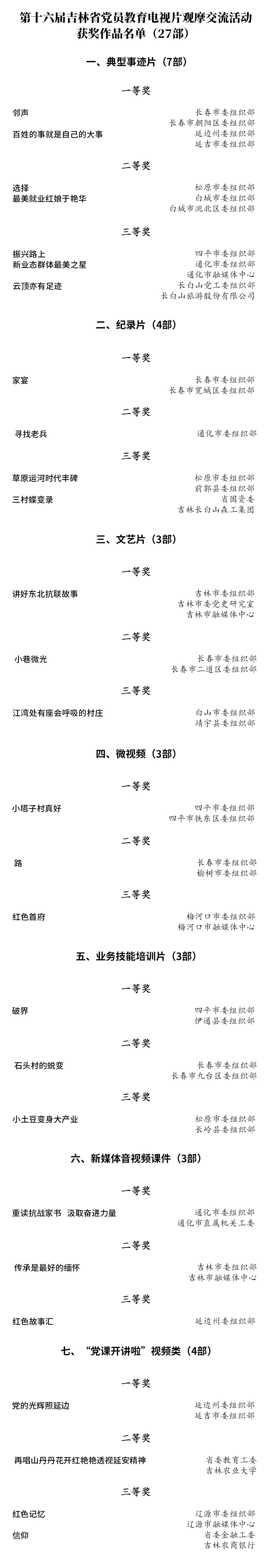 各市(州),长白山保护开发区,梅河口市,省委金融工委、省直机关工委、省委教育工委、省国资委等15个地区和单位选送了91部作品。参照全国党员教育电视片观摩交流活动评审标准和程序,主办方组织了初审筛选、评委评审、复核把关等,最终评选出一等奖作品8部、二等奖作品8部、三等奖作品11部,合计27部。获奖作品将在吉林广播电视台党建栏目展播,同时作为全省党员教育重点教材,在“吉林省党员教育网”等省内党员教育平台展播,优秀作品推荐到全国党员教育平台。