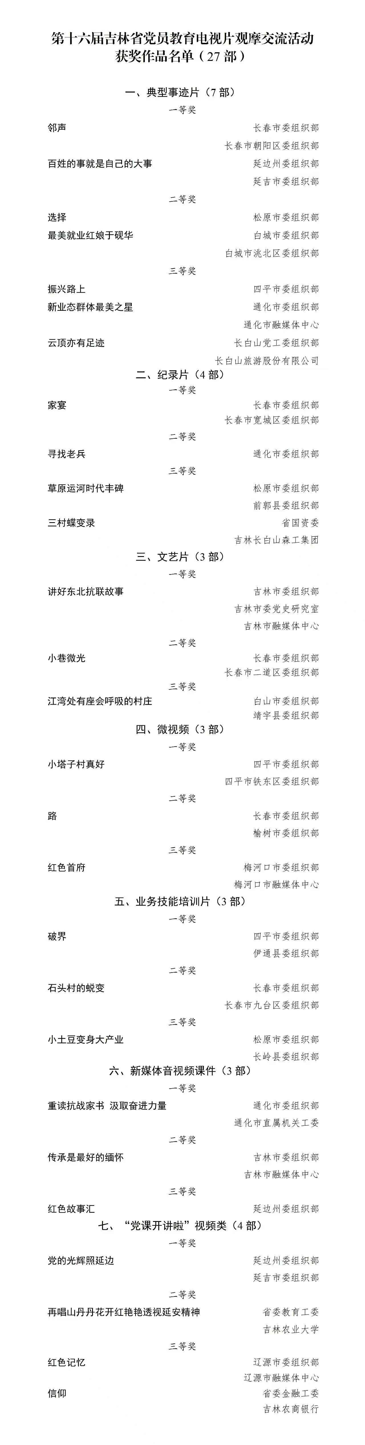 各市(州),长白山保护开发区,梅河口市,省委金融工委、省直机关工委、省委教育工委、省国资委等15个地区和单位选送了91部作品。参照全国党员教育电视片观摩交流活动评审标准和程序,主办方组织了初审筛选、评委评审、复核把关等,最终评选出一等奖作品8部、二等奖作品8部、三等奖作品11部,合计27部。获奖作品将在吉林广播电视台党建栏目展播,同时作为全省党员教育重点教材,在“吉林省党员教育网”等省内党员教育平台展播,优秀作品推荐到全国党员教育平台。